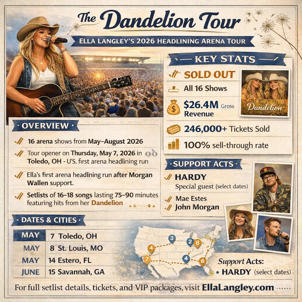 On Saturday, May 30, 2026, Ella Langley takes the direct support slot for Night 2 of Wallen’s Denver two-night stand. Her Dandelion album is seven weeks into its release. Her setlist is at peak road-tested form after stadium dates in Tuscaloosa, Indianapolis, and Gainesville.